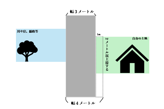 もし、向かい側が川や崖、線路等の場合は道路の向こう側の端から4mになるように、