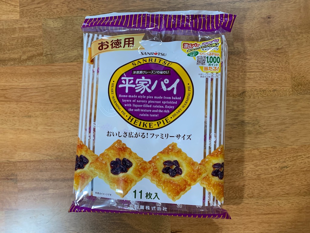 パイ生地に洋酒漬けレーズンをトッピングし、ていねいに焼きあげたパイで、源氏パイがサクサクな食感に対し平家パイはふんわりしっとりレーズンもっちりな食感です。
